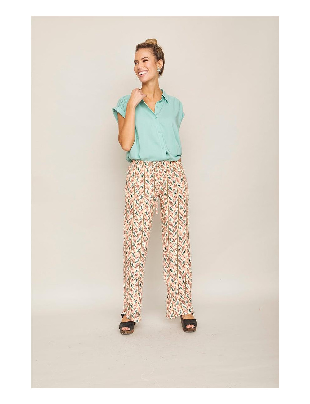 Pantalón con talle normal y cintura elástica, completamente recto. Sienta genial Tejido: 100% viscosa.